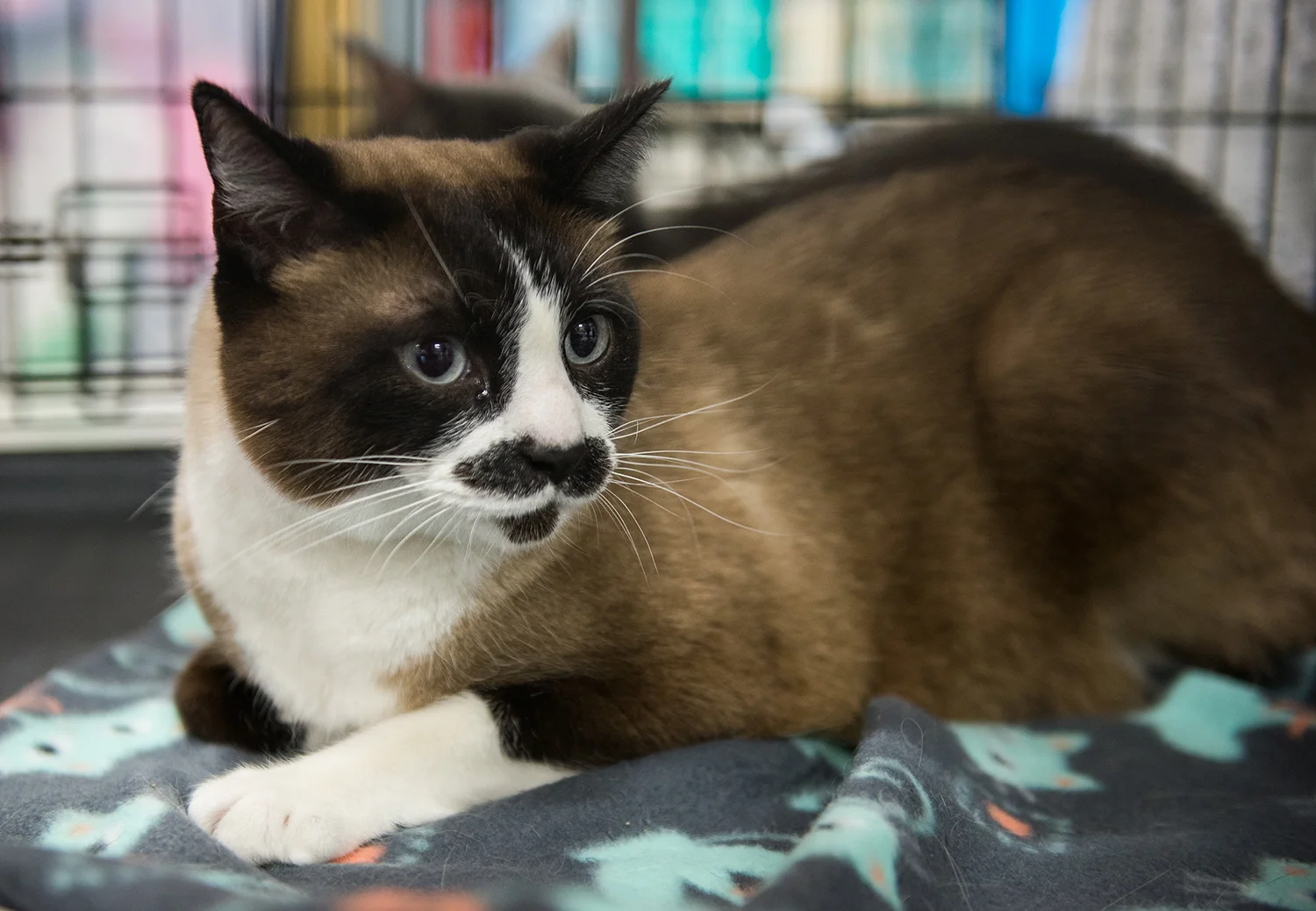 Bella (gray) and Groucho (Snowshoe) are a bonded pair, but can be adopted separately. Their elderly owner passed away, leaving them without a home, so we took them into foster care. They are VERY sweet!! We estimate them to be about 3 years old.