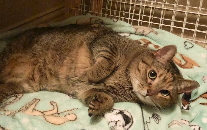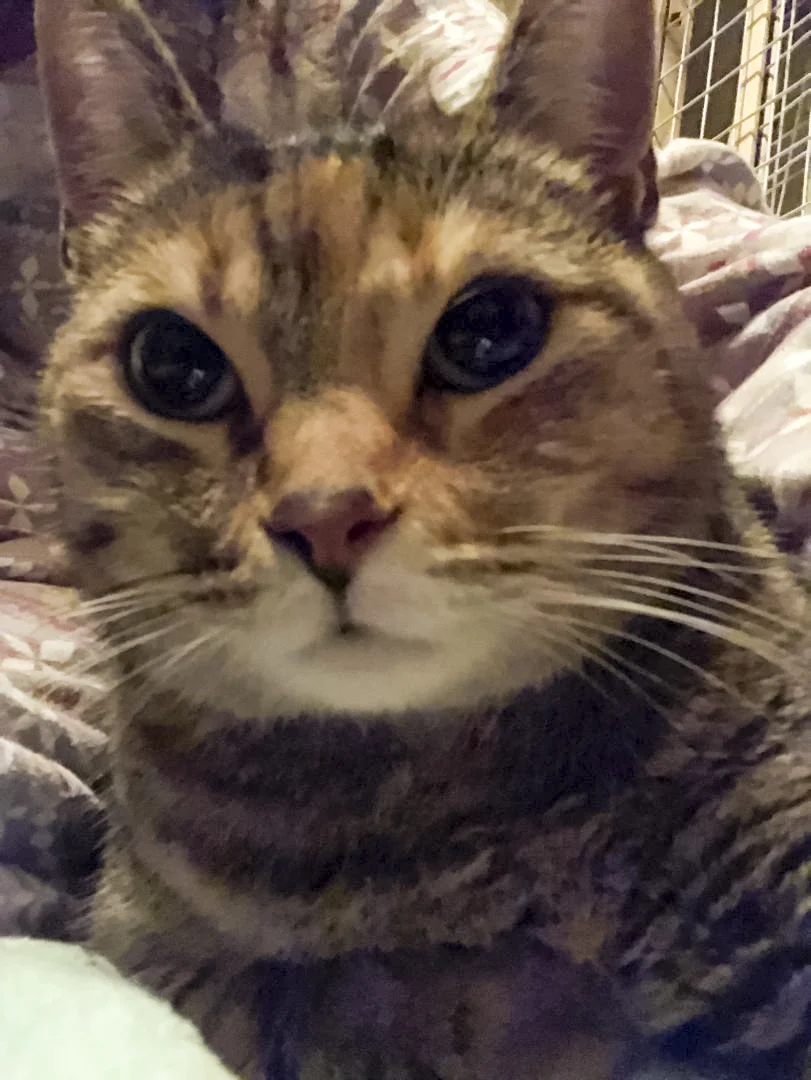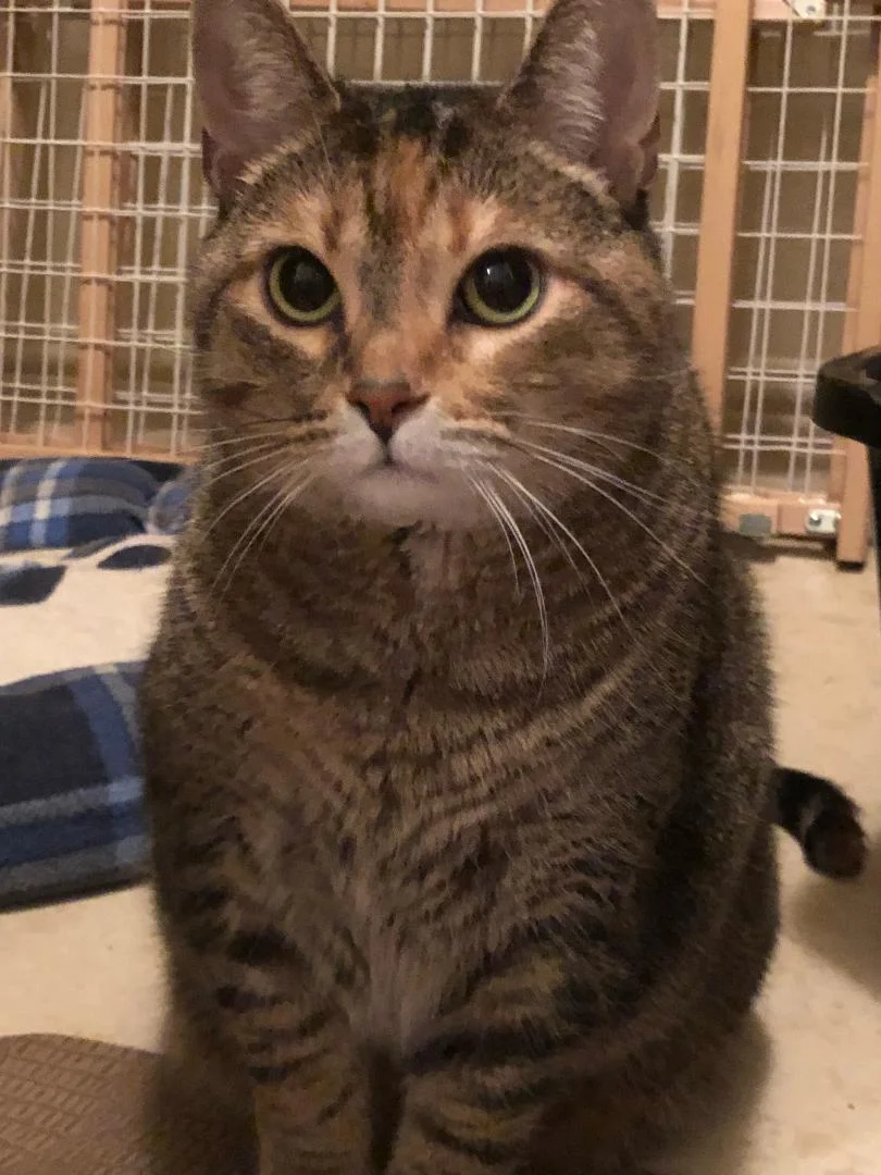 Buggy - 4 years old, female, shy but sweet, front and back declawed. Brown tiger with tortoise orange markings.